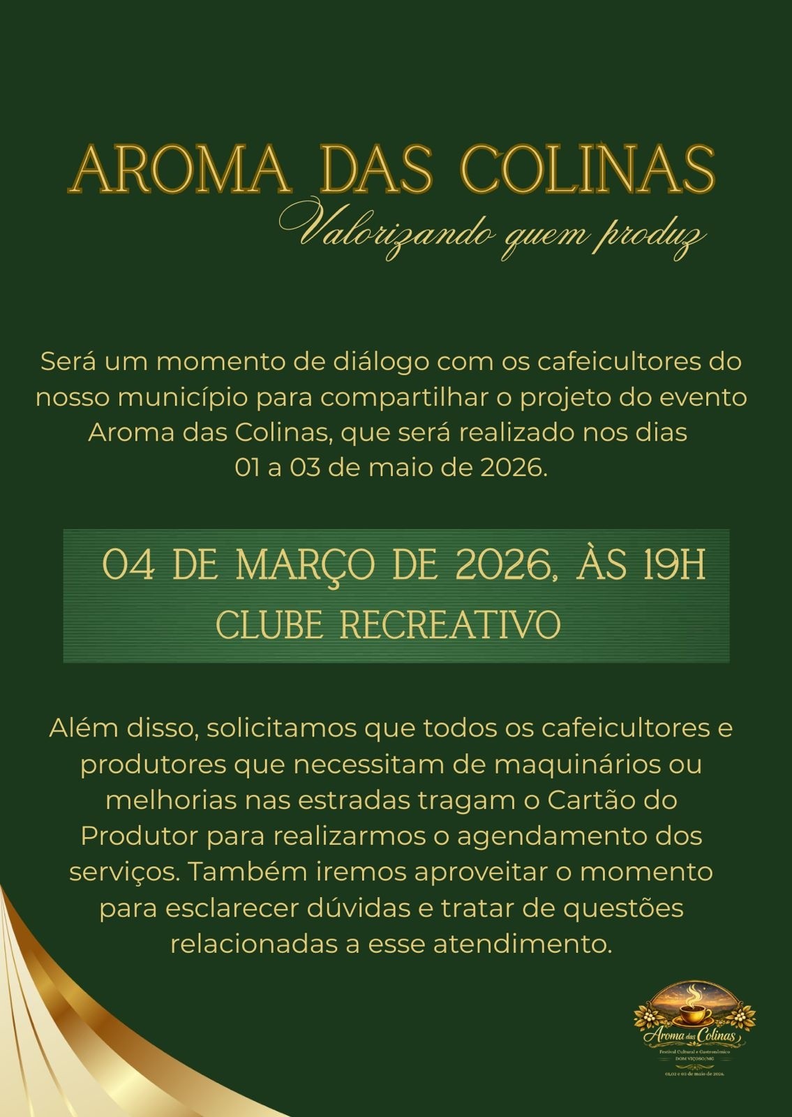 A Administração Municipal, juntamente com a Secretaria de Cultura e Turismo, irá apresentar aos cafeicultores do nosso município o Festival Aroma das Colinas.
