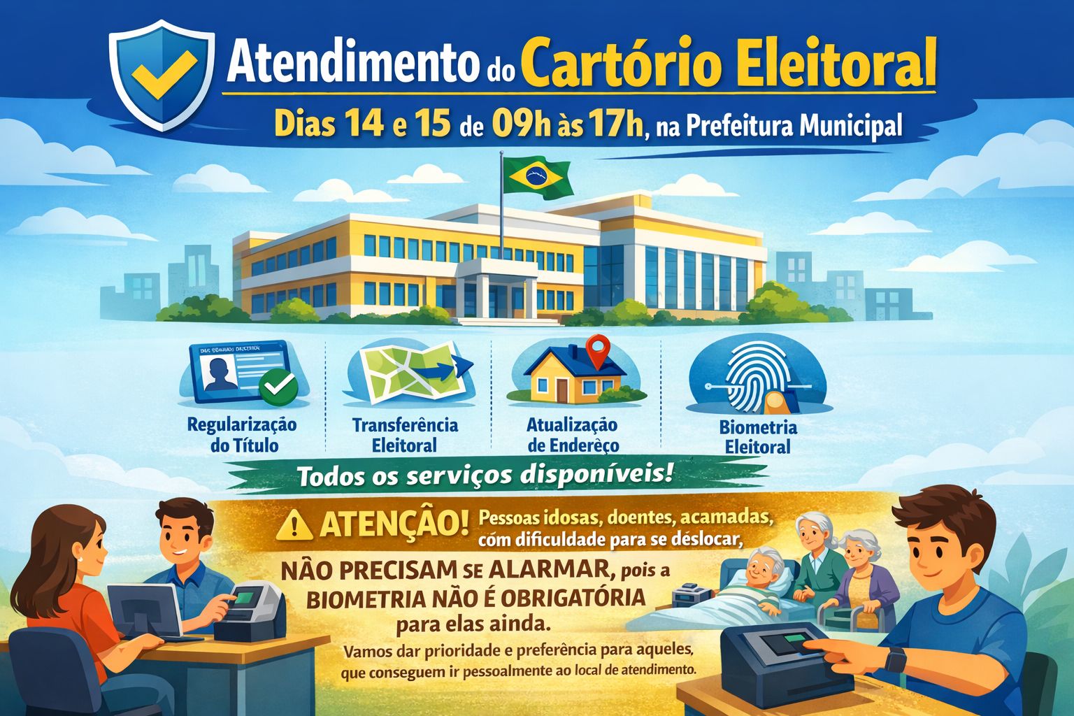 O Cartório Eleitoral estará realizando atendimento em nossa cidade nos dias 14 e 15, das 09h às 17h, na Prefeitura Municipal.