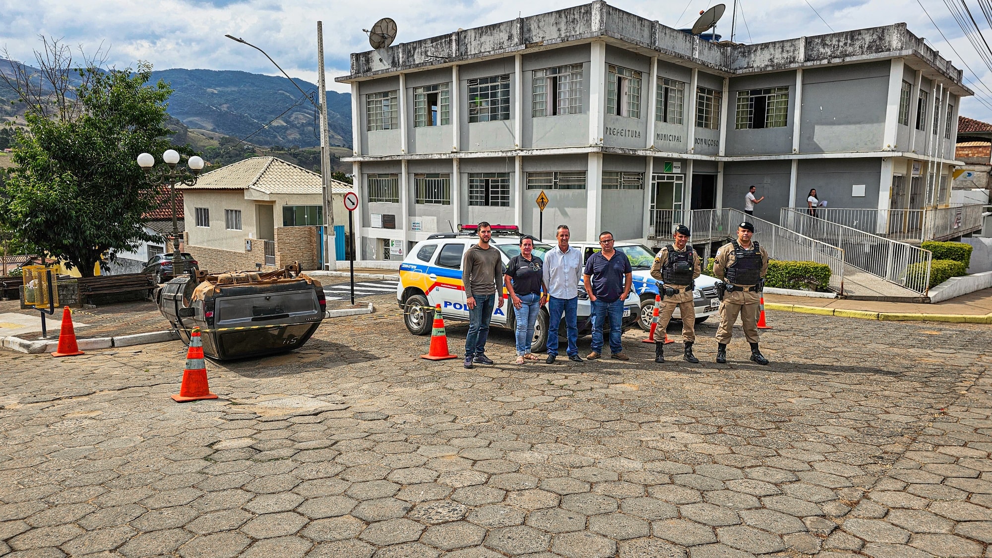 Um carro capotado foi colocado em frente à Prefeitura Municipal