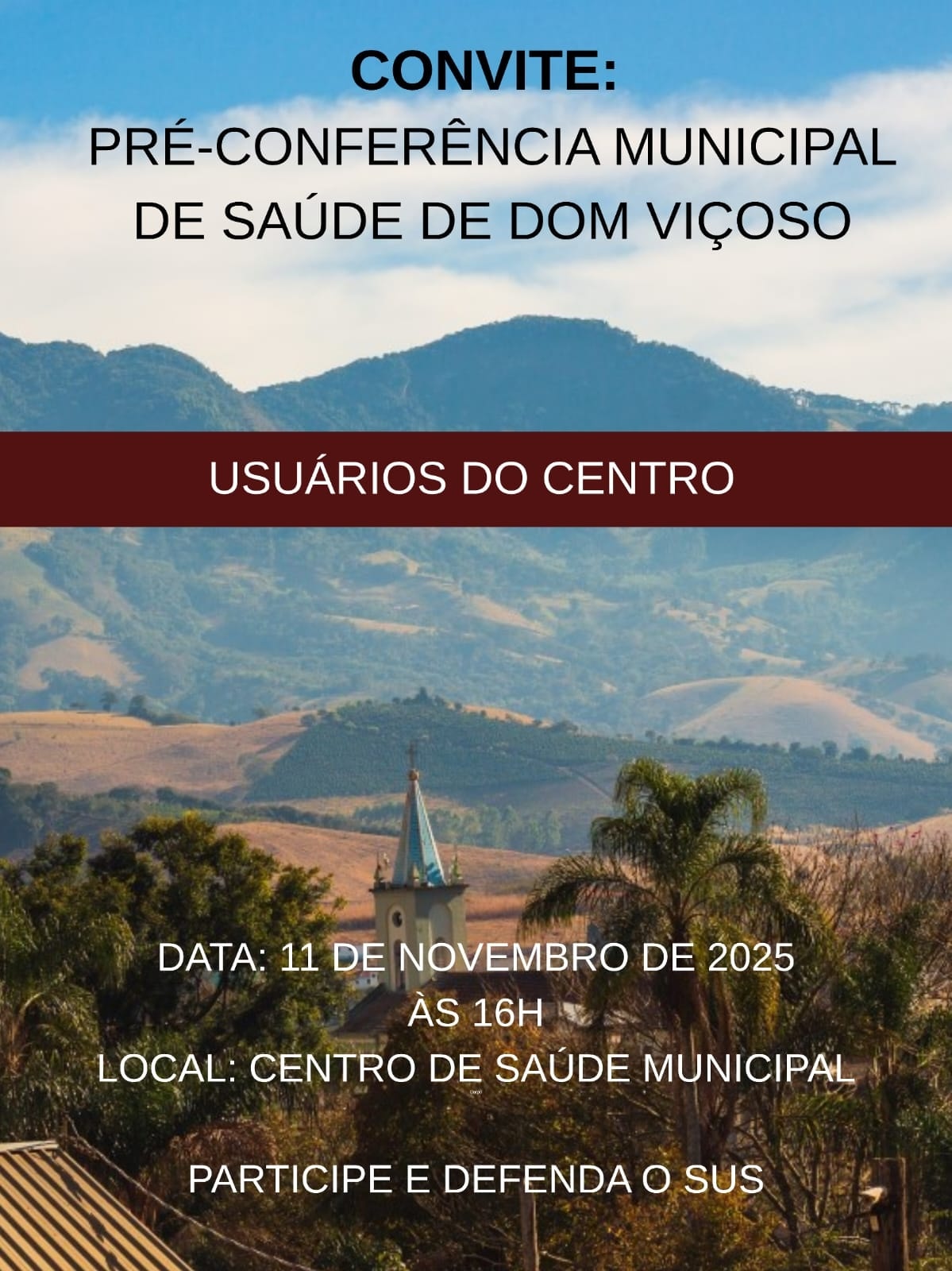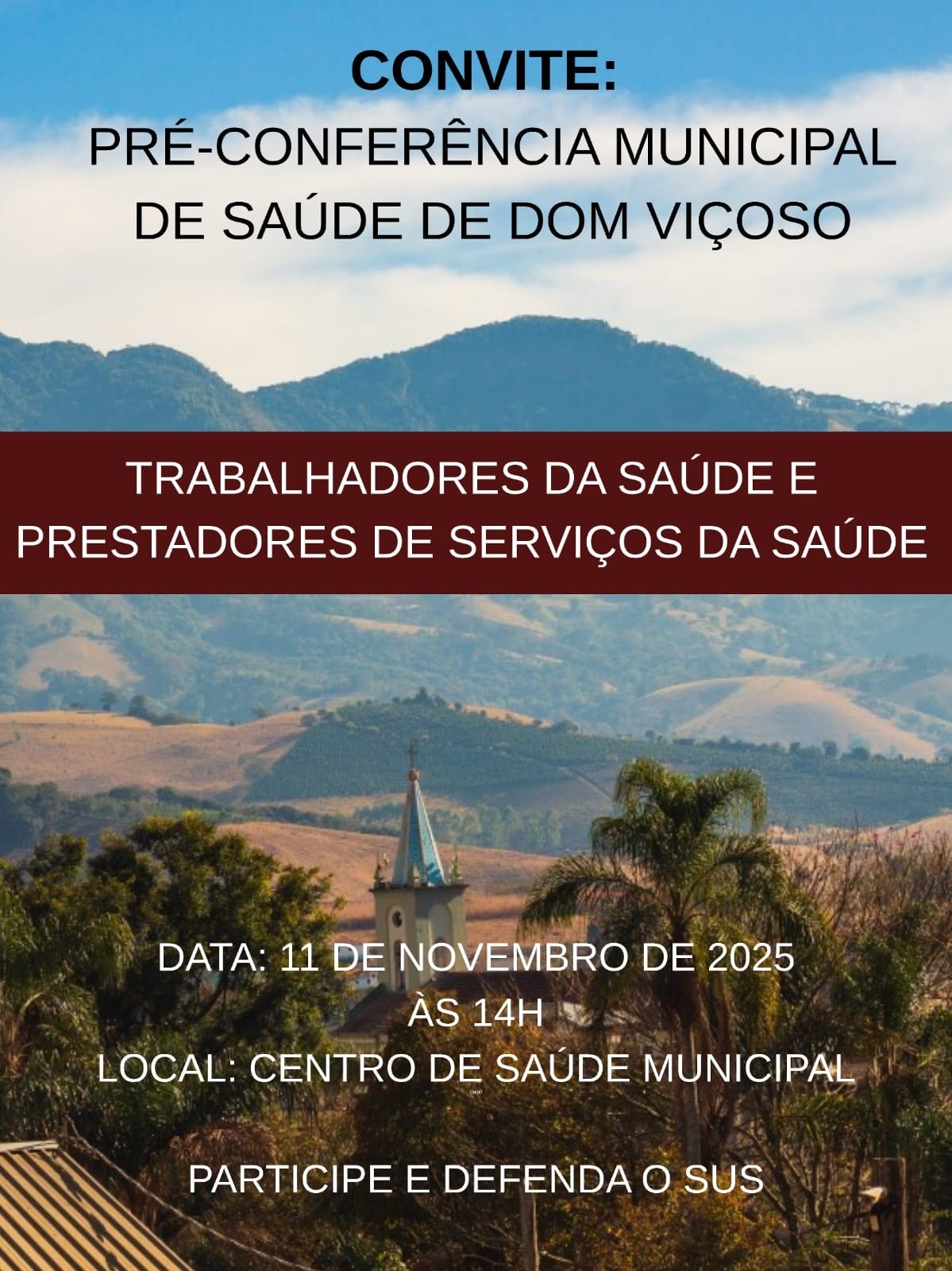 A Prefeitura Municipal de Dom Viçoso, por meio da Secretaria Municipal de Saúde, convida toda a comunidade para participar das Pré-Conferências Municipais de Saúde.